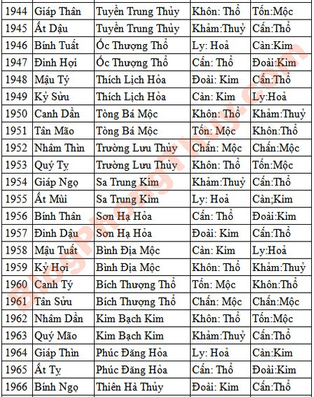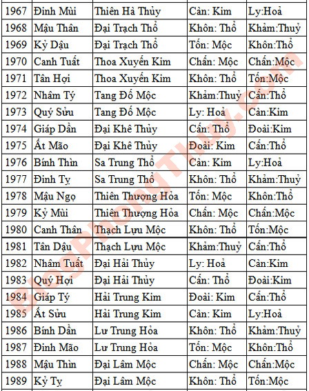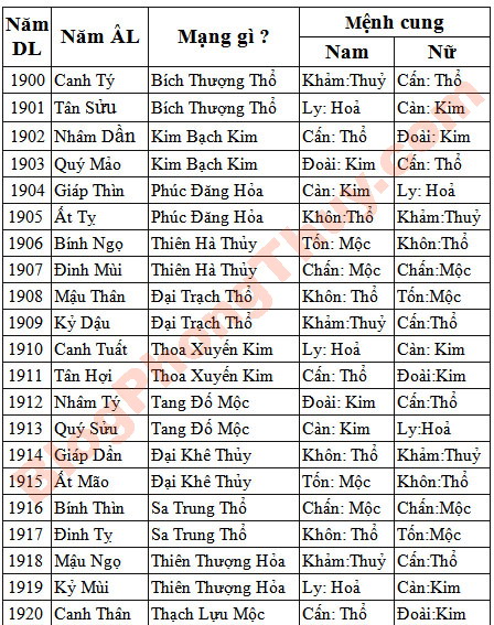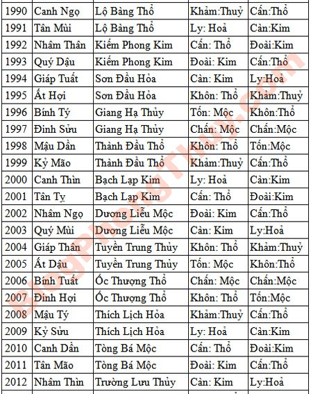 – Mệnh cung Cấn, Khôn, thuộc hành Thổ.Màu sắc hợp: Màu đỏ, hồng, cam, tím, thuộc hành Hỏa (tương sinh, tốt). Màu vàng, nâu, thuộc hành Thổ (tương vượng, tốt). Màu sắc kỵ: Xanh lục, xanh da trời thuộc hành Mộc , khắc phá mệnh cung hành Thổ, xấu.