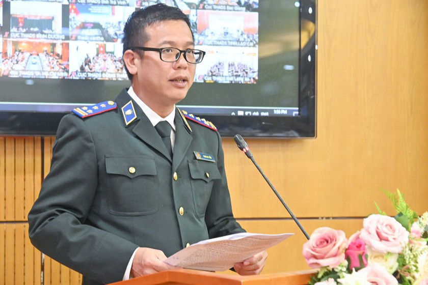 | Chánh Văn phòng Tổng cục THADS Phan Huy Hiếu báo cáo tại hội nghị. |