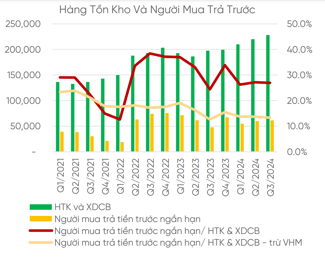 | Diễn biến hàng tồn kho và người mua trả trước trên thị trường bất động sản (Q1/2021 – Q3/2024). Nguồn: VPBank Securities. |