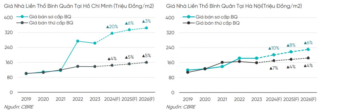 | Diễn biến giá nhà liền thổ bình quân tại TP.HCM và Hà Nội (2019 – Dự báo 2026). Nguồn: CBRE. |