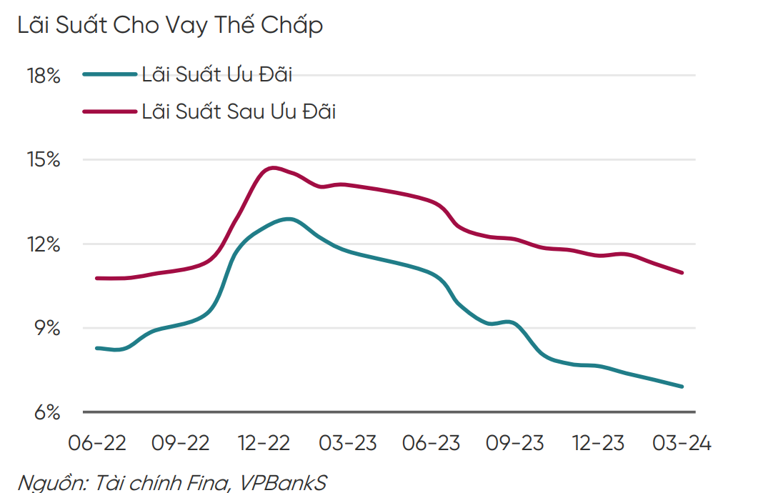| Diễn biến lãi suất cho vay thế chấp tại Việt Nam (06/2022 – 03/2024). Nguồn: Tài chính Fina, VPBankS. |