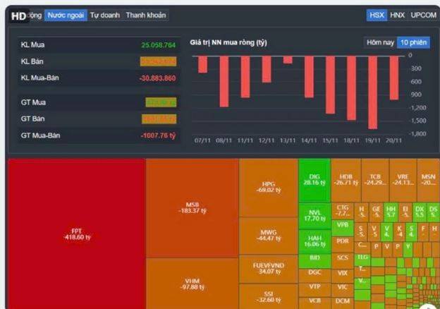 Kết thúc phiên giao dịch ngày 20/11, thị trường chứng khoán bị bán mạnh, chủ yếu do hoạt động bán ròng của khối ngoại, khiến khả năng kéo chỉ số lên cao là rất khó. Tuy nhiên, điểm tích cực là vẫn có sự hồi phục mạnh mẽ ở phần đầu phiên, giúp thị trường rút chân khỏi các mức đáy.
