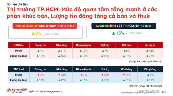 Trao đổi với phóng viên Báo Hànôịmới, ông Đinh Minh Tuấn, Giám đốc kinh doanh khu vực miền Nam của Batdongsan.com.vn cho biết, thị trường bất động sản thành phố Hồ Chí Minh quý IV-2024 đón nhận nhiều thông tin tích cực. Tâm lý tìm kiếm bất động sản tăng mạnh trong tháng 10 ở hầu hết các phân khúc, trong đó nổi bật là nhà riêng lẻ tăng 11%, đất dự án tăng 16% và nhà phố tăng 10%; nguồn cung mới ở phân khúc chung cư tăng mạnh so với cùng kỳ năm trước, tập trung chủ yếu ở khu vực phía Đông; tiến độ các dự án như metro số 1, cao tốc thành phố Hồ Chí Minh – Long Thành – Dầu Giây giúp cải thiện kết nối khu vực và tạo sức hút cho bất động sản xung quanh; những chính sách quản lý của chính phủ cũng góp phần giúp cho thị trường hồi phục nhanh hơn so với dự báo.